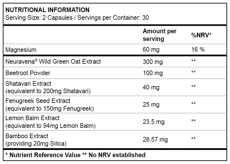 Rizsliszt, Neuravena® vad zöldzab-kivonat, kapszulahéj (hidroxipropil-metilcellulóz), céklapor, magnézium-oxid, shatavari 5:1 kivonat, színező élelmiszer (céklalé), bambusz kivonat (70% szilícium-dioxid), görögszénamag 6:1 kivonat, citromfű 4:1 kivonat, csomósodást gátló anyag (magnézium-sztearát).