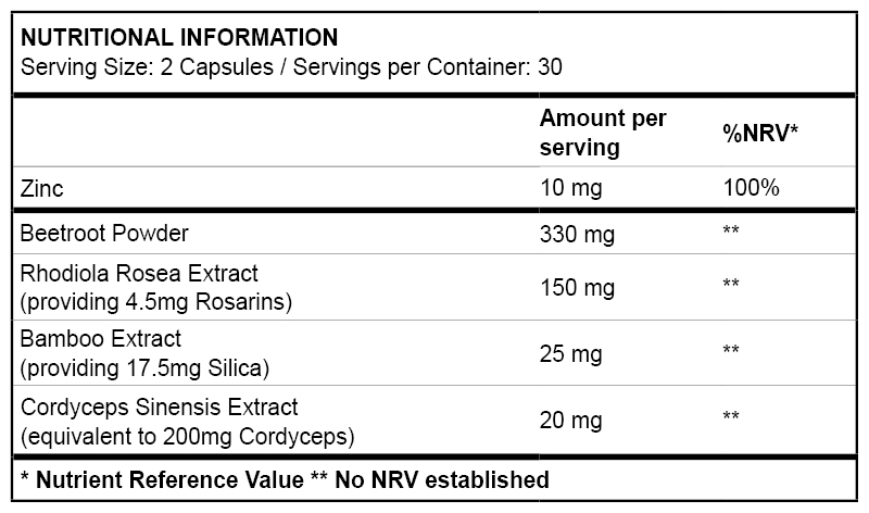 Céklapor, kapszulahéj (hidroxipropil-metilcellulóz), rizsliszt, Rhodiola rosea kivonat (3% rosarin), spirulina (színezék), csomósodást gátló anyag (magnézium-sztearát), bambuszkivonat (70% szilícium), Cordyceps sinensis 10:1 kivonat, cink-oxid.