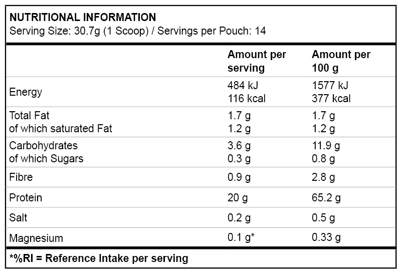 Legelőn tartott tehenektől származó tejsavófehérje-izolátum (tej), legelőn tartott kollagén peptidek, természetes vanília aroma, MCT olajpor (tej), magnézium-citrát, napraforgó-lecitin, édesítőszer: szteviol-glikozid.